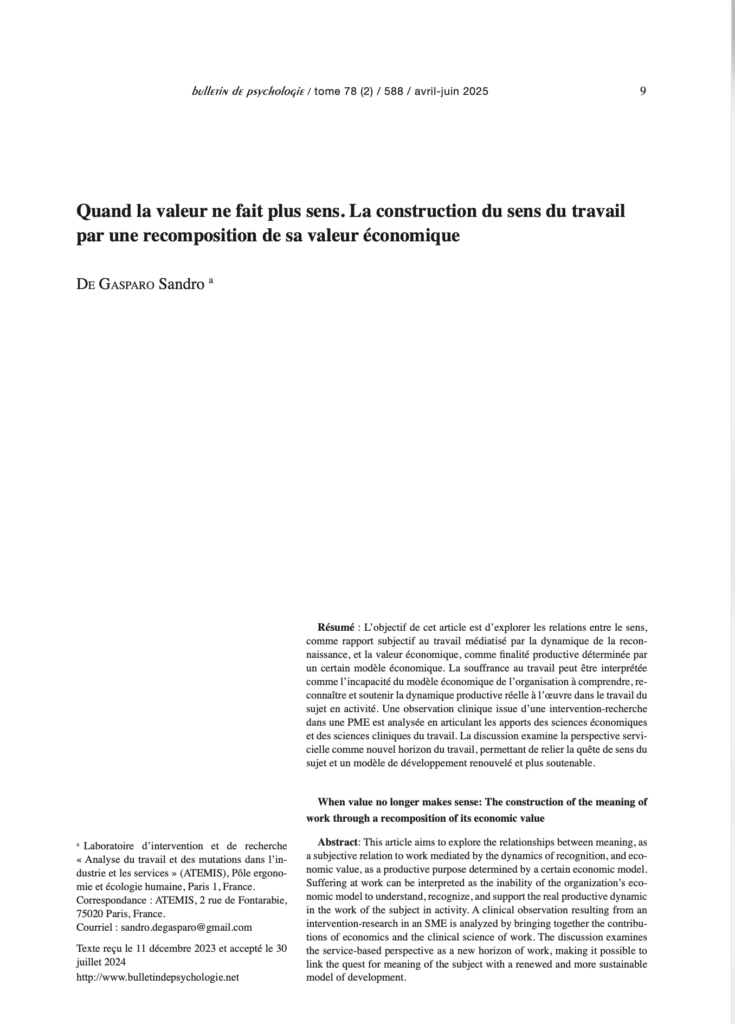 Cet article explore la relation entre sens du travail (reconnaissance) et valeur économique (finalité productive), avançant que la souffrance au travail peut être interprétée à partir d’un modèle économique incapable de reconnaître la dynamique productive réelle des travailleurs. L’auteur soutient que la perspective servicielle, centrée sur la qualité des relations et la coproduction, renouvelle l’articulation entre quête de sens et développement économique. L’analyse repose sur une intervention-recherche clinique menée dans une PME, combinant entretiens, observations et ateliers collectifs, pour relier expérience subjective et transformations du modèle économique de l’organisation.